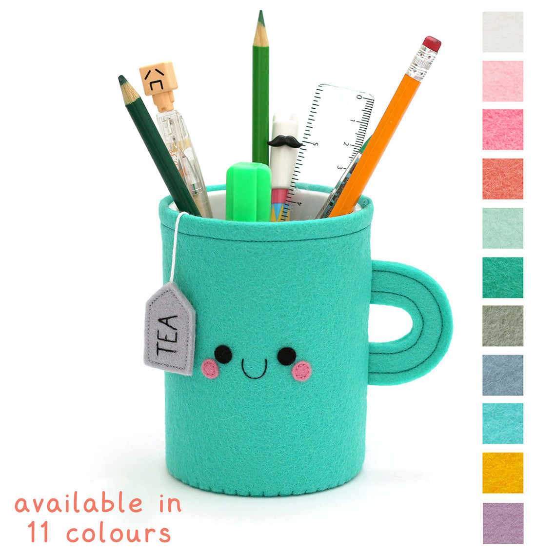A very happy teacup pen pot in your choice of felt colour, felt swatches for each colour can be seen in the 3rd image. Features a tea tag with a heart on one side and 'TEA' hand-stitched onto the other.